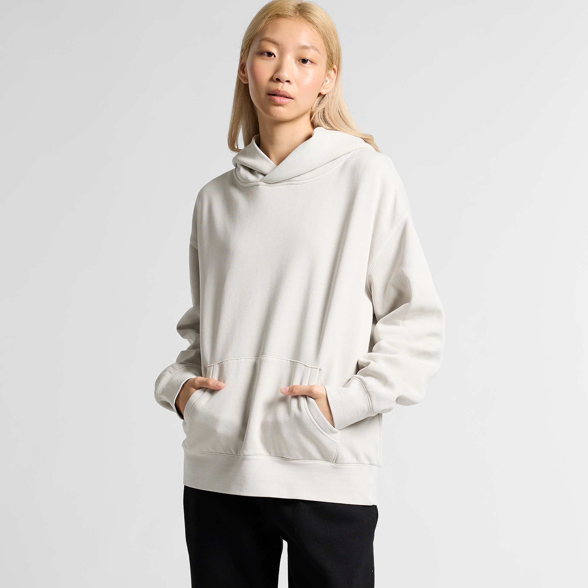 Pullover hood, drop shoulder, kangaroo pocket, self-fabric lined hood, no drawcord, garment dyed, sleeve cuff ribbing